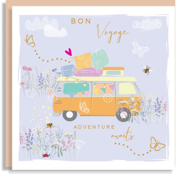 Tags: Bon Voyage Campervan Card, Occasion, Leaving, glittered greeting card, hand-finished, contemporary hand-illustrated, SABIVO, Sabivo Design